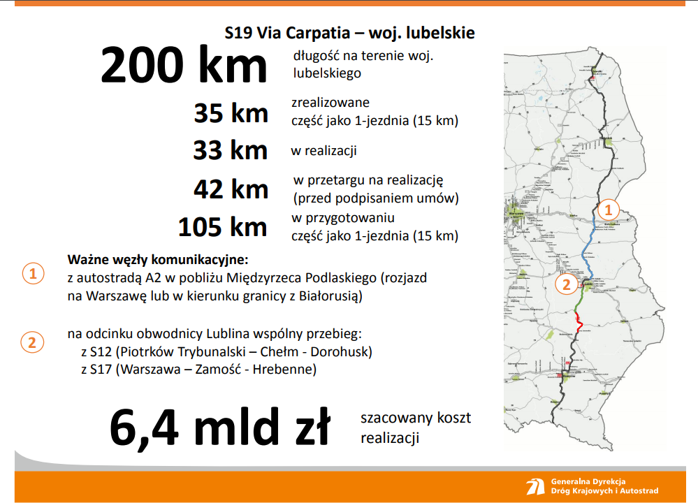 W przygotowaniu jest już cały odcinek przyszłej S19 od granicy z woj. mazowieckim do obwodnicy Lublina. W grudniu ub. roku podpisano umowy na opracowanie koncepcji programowych dla sześciu odcinków realizacyjnych o łącznej długości ponad 81 km pomiędzy granicą województw a węzłem Lubartów Północ. Dziś zawarto umowę na dalszy odcinek do obwodnicy Lublina. Zgodnie z PBDK 2014 – 2023 (z perspektywą do 2025) budowa tych odcinków ma zakończyć się w 2024 roku.