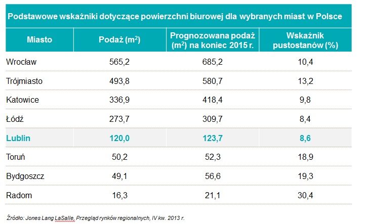 - Na koniec 2014 r. całkowita podaż nowoczesnej powierzchni biurowej w Lublinie wynosiła 120 tys. m2